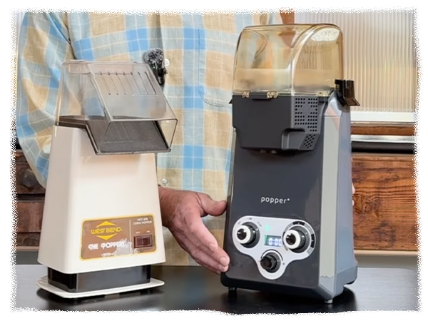 The air popcorn popper of the 1970s (pictured on the left) is a hallmark of home coffee roasting. Our version, Popper is a Coffee Roaster, takes the basic hot air chamber design and adds controls for heat, fan and time. If you're looking to explore roasting further or want to have more control on your roast, the Popper's a great option.